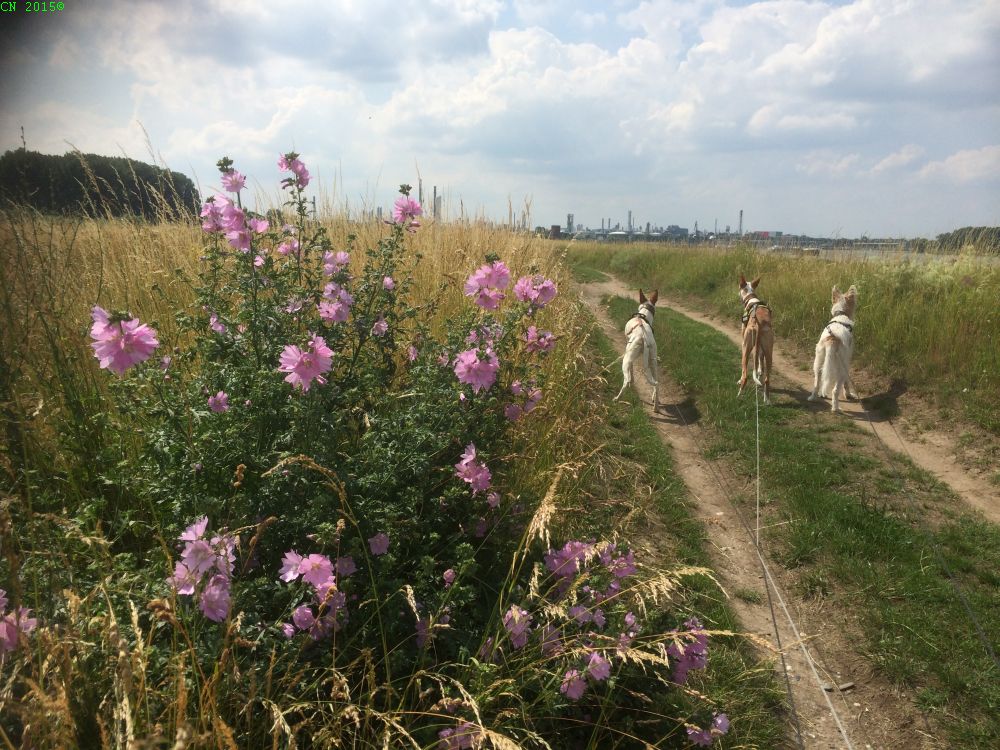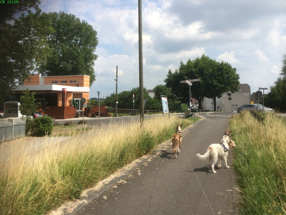 Die zwei Rennradler sind schnell unterwegs und schon fast auf unserer Höhe. Meine Hunde schnüffeln gerade gemeinsam auf der anderen Wegesseite – kein Kollisionsrisiko. Schon sind die Zwei an uns vorbei. Ganz ohne Konflikt. Hmm 😐