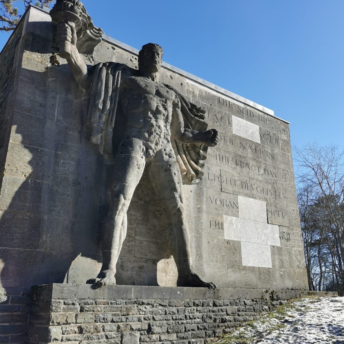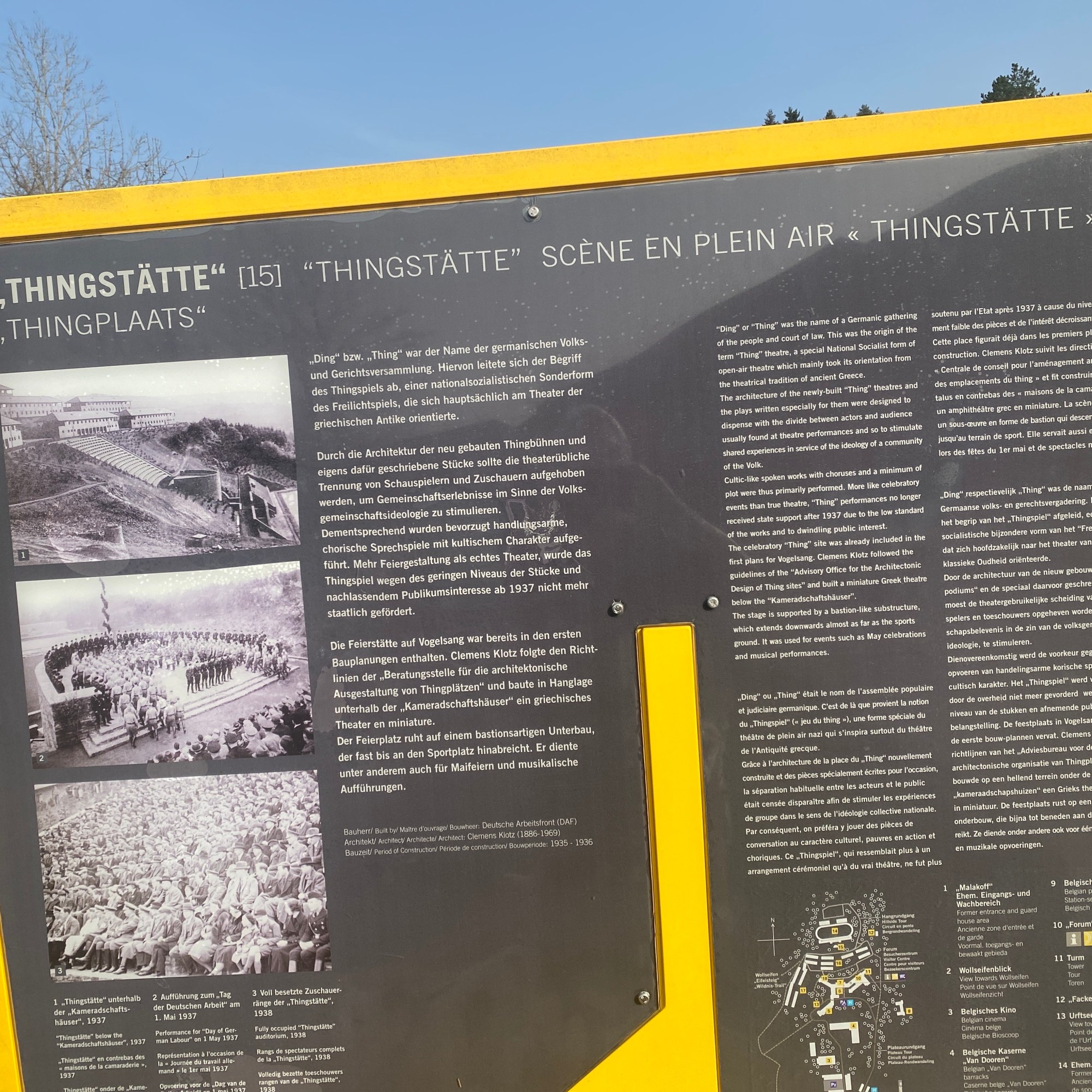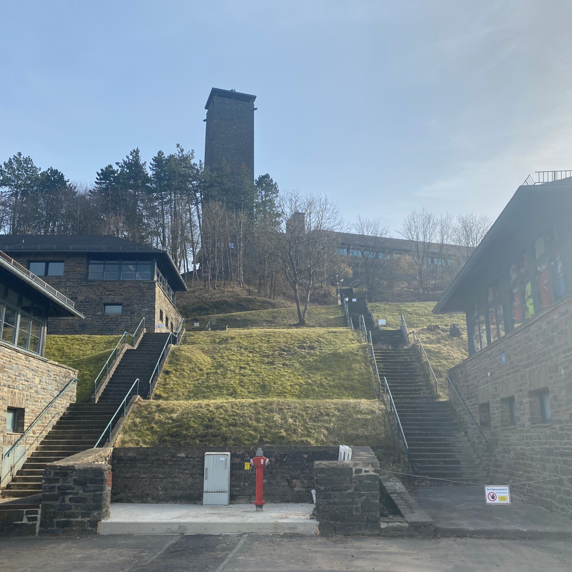 - den Abstieg (ca. 3 km) zur sehr imposanten ehemaligen NS-Ordensburg Vogelsang (ca. 400m NN), heute Vogelsang Internationaler Platz (IP) mit eindrucksvollen festen Dokumentationen und Wechselausstellungen (aktuell natürlich wegen Corona geschlossen);