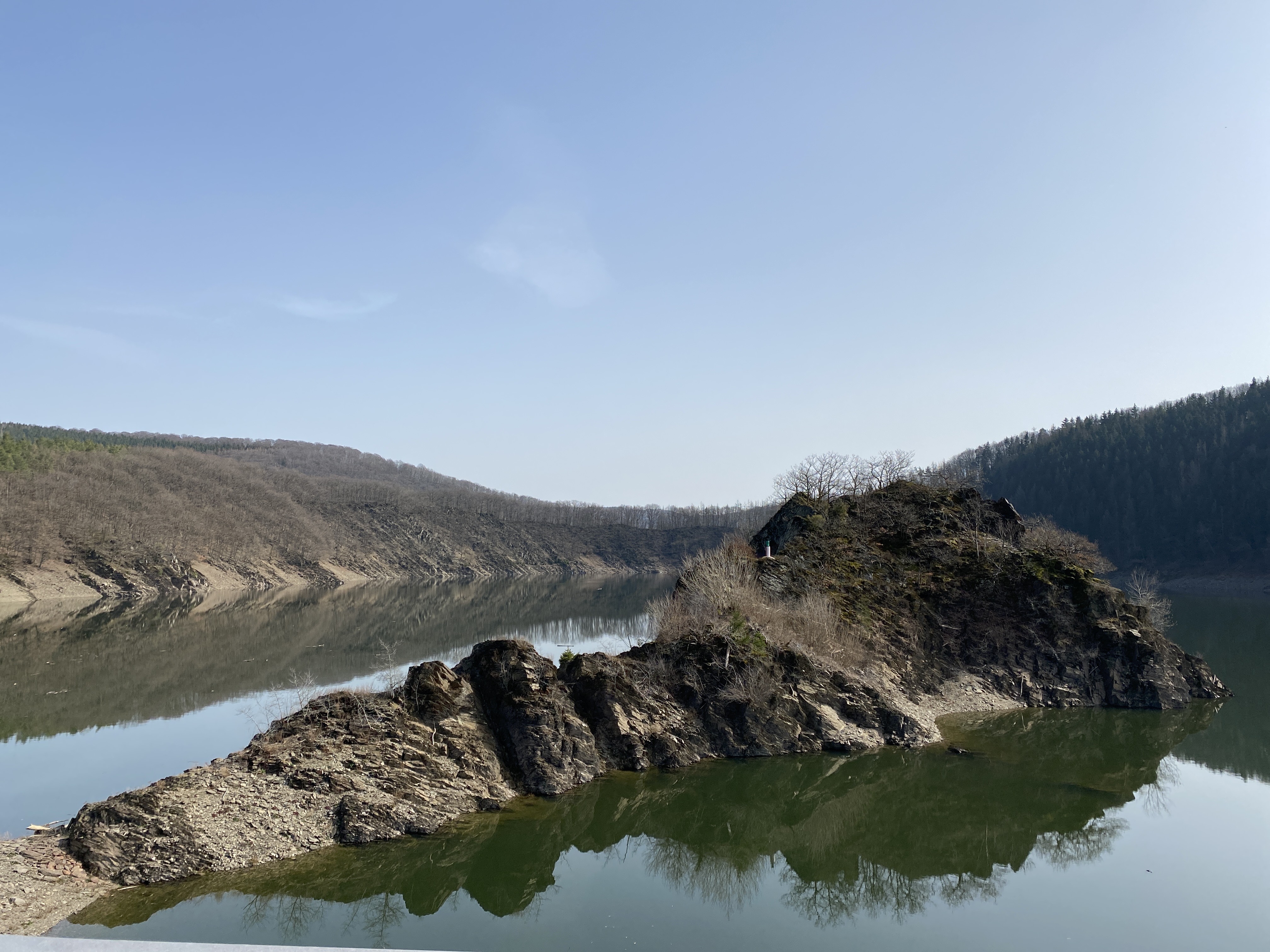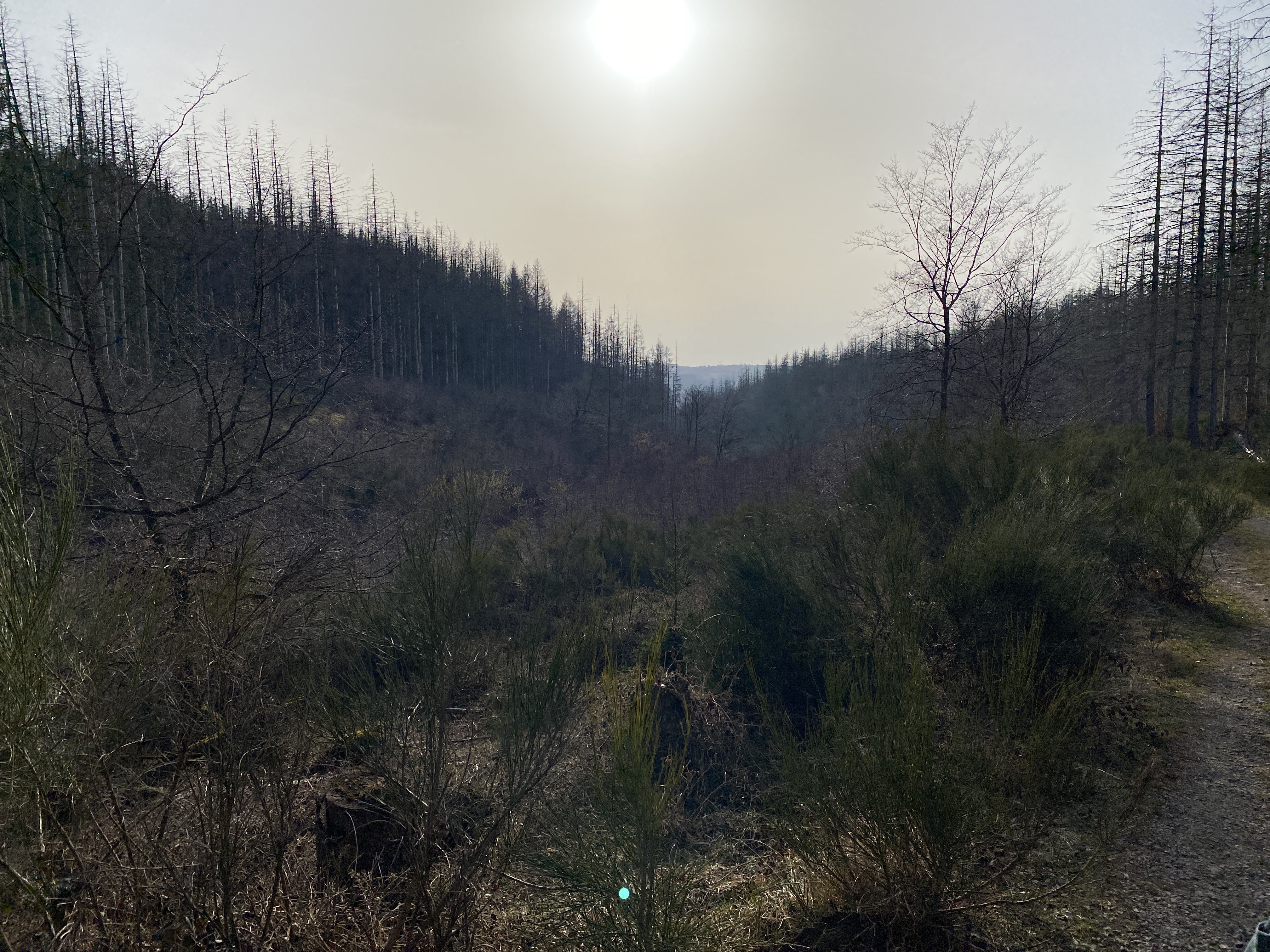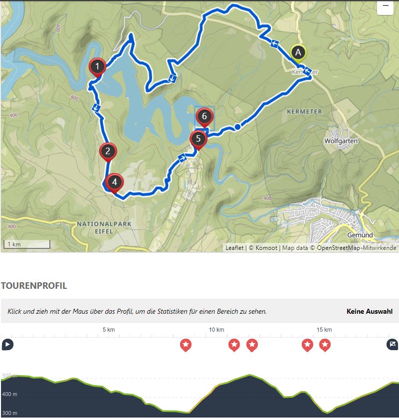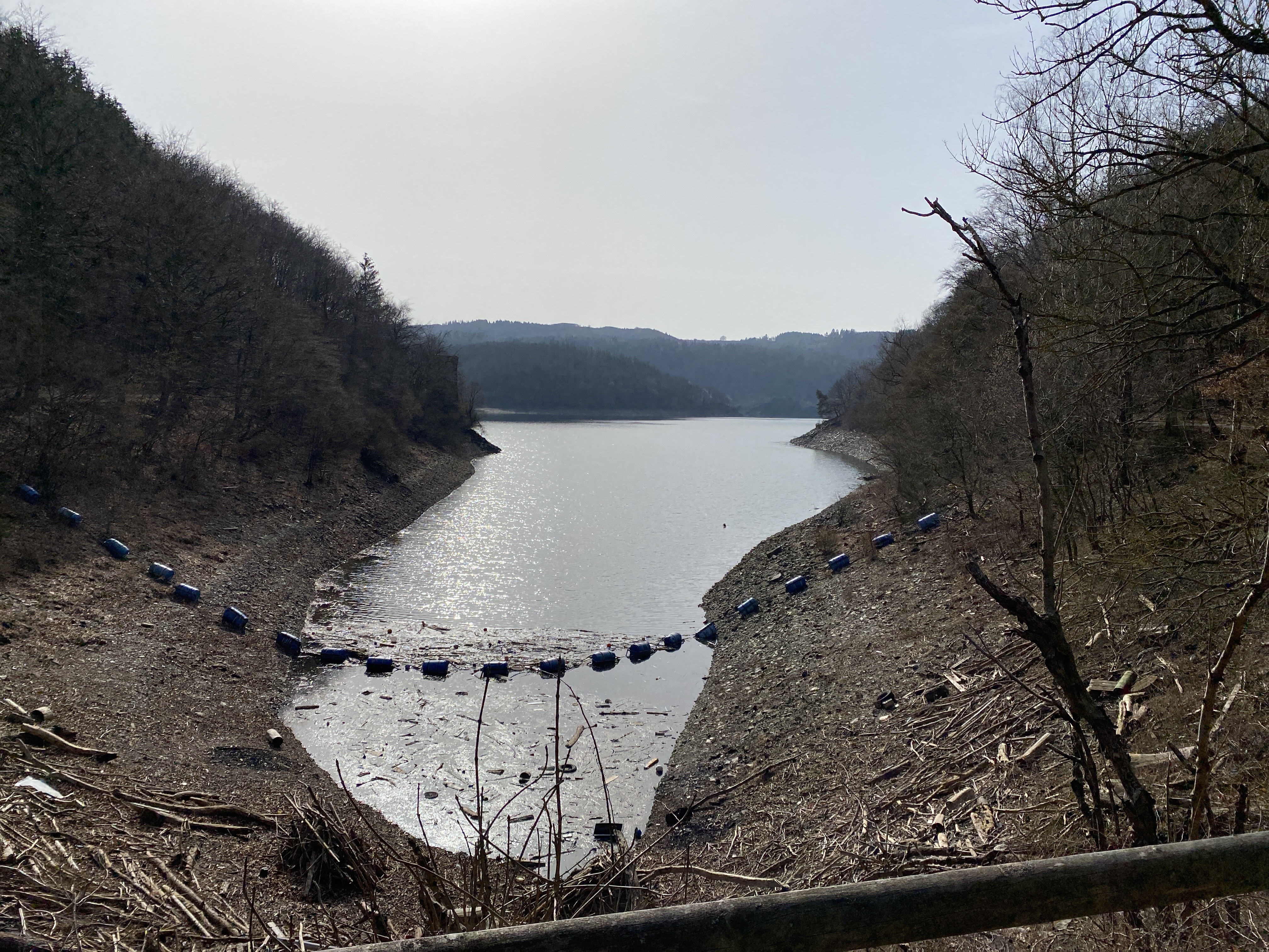 - den Abstieg (ca 8,5 km) vom Wanderparkplatz auf dem Kermeter (528m NN) durch den unbewirtschafteten, durch das Fichtensterben stark im Wandel begriffenen Wald des Nationalparks zur Urftstaumauer mit Innen- und Außengastronomie, die aktuell wegen Corona geschlossen sind; man kann aber zumindest dort sein mitgebrachtes Picknick verzehren;