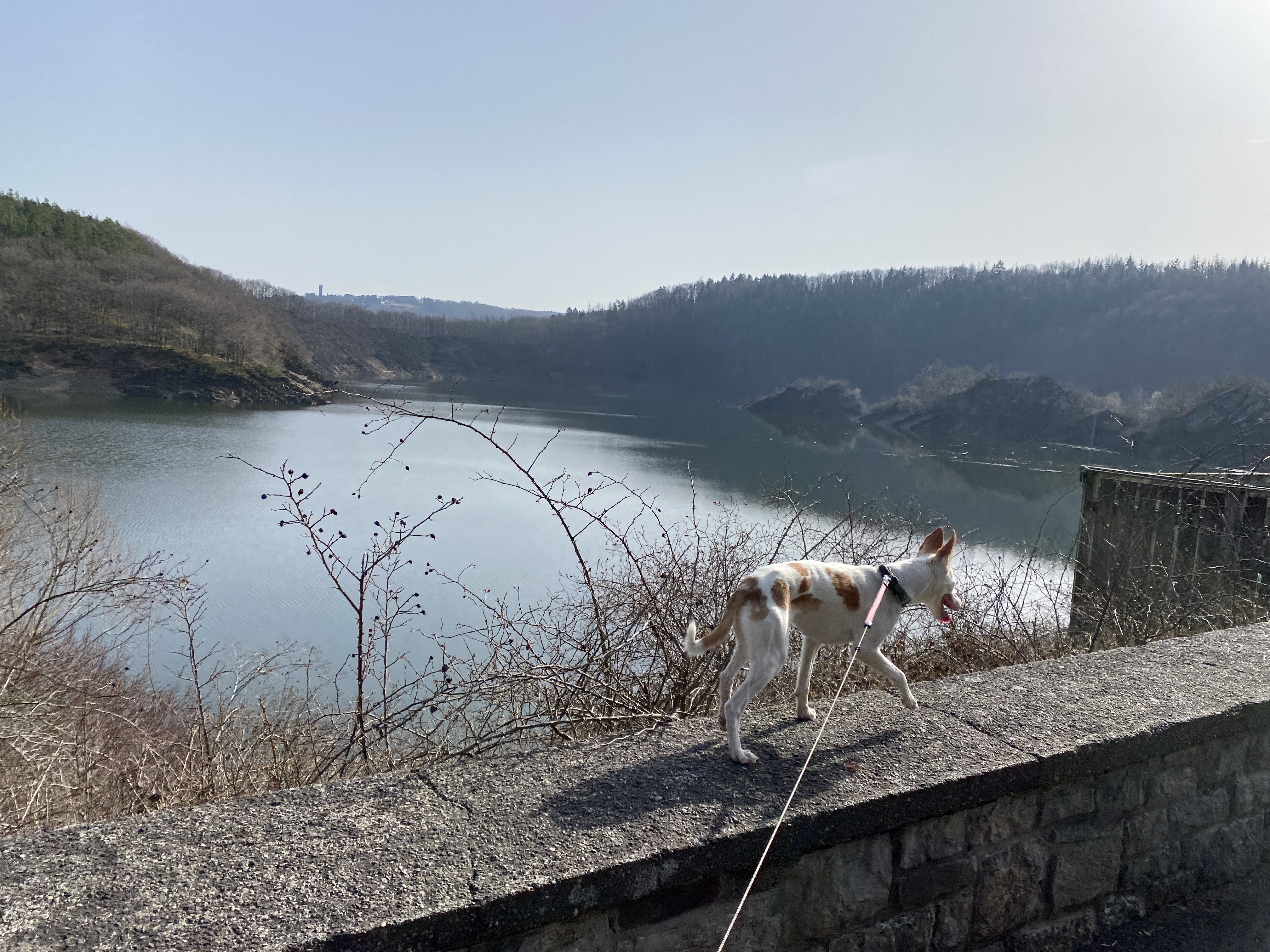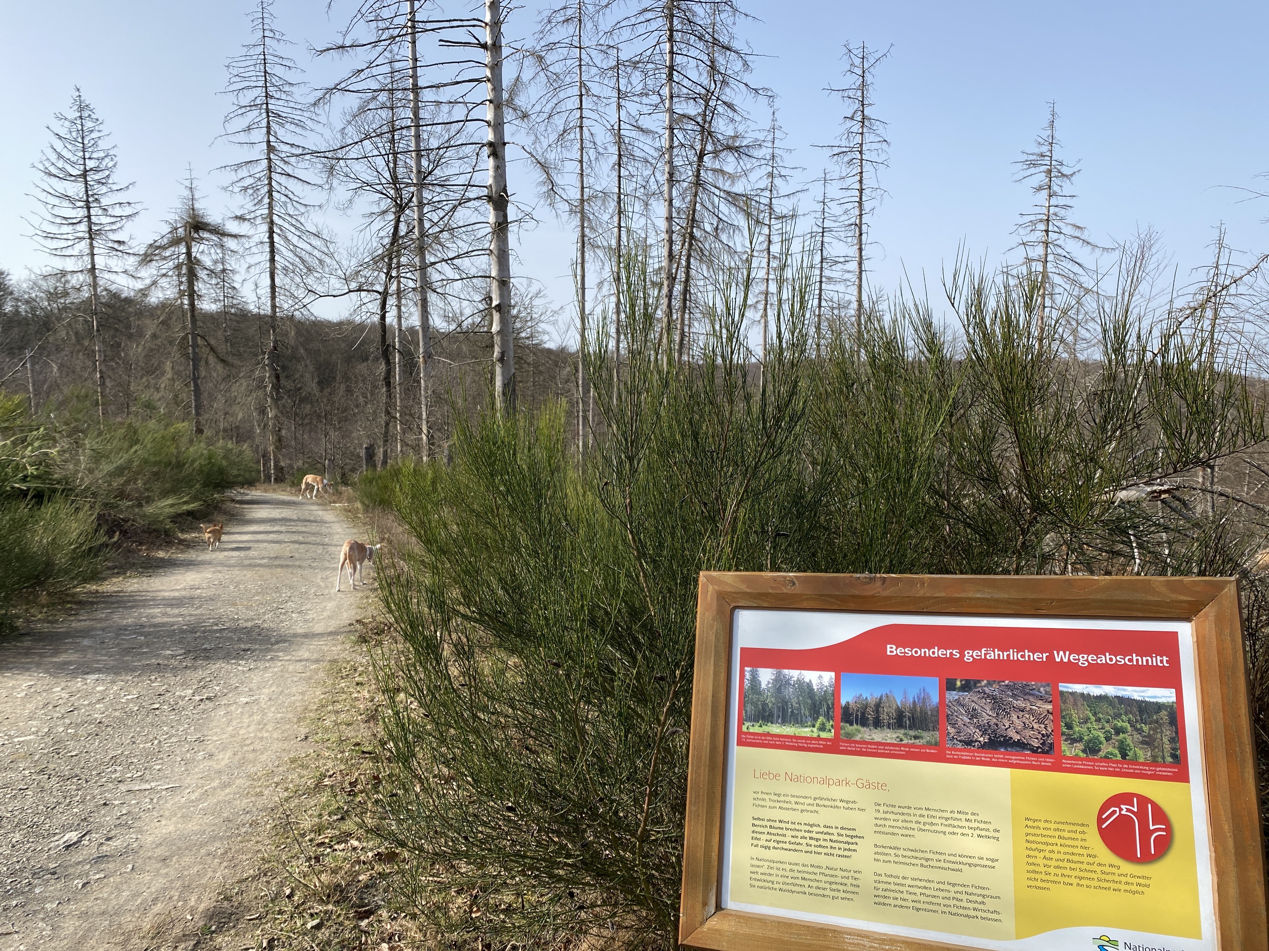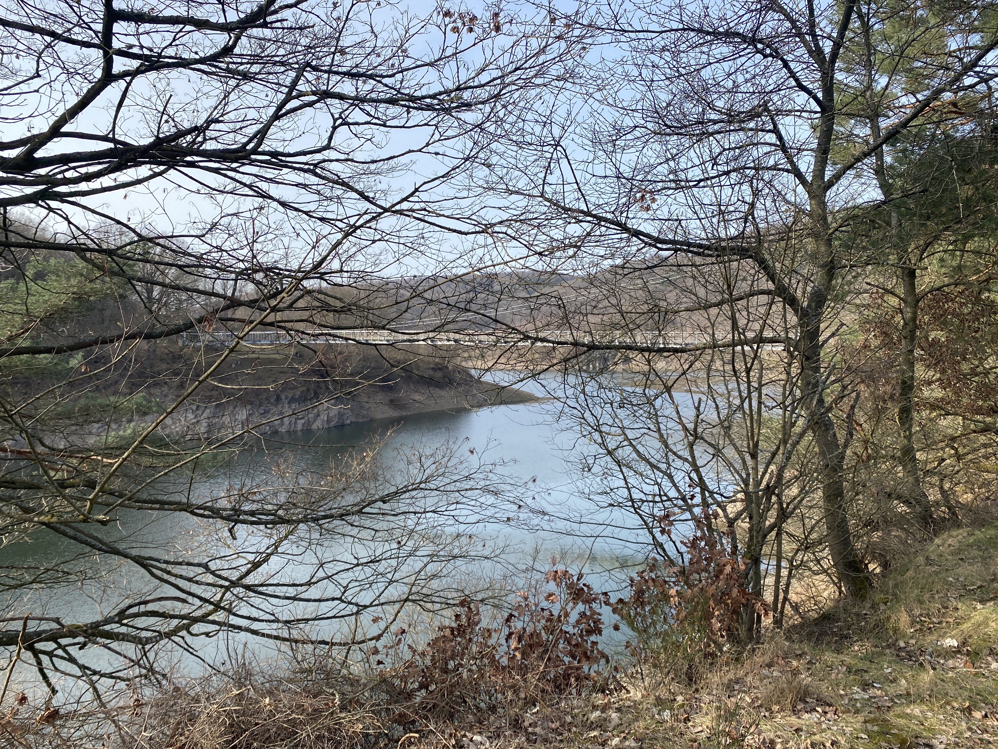 - den Abstieg (ca 8,5 km) vom Wanderparkplatz auf dem Kermeter (528m NN) durch den unbewirtschafteten, durch das Fichtensterben stark im Wandel begriffenen Wald des Nationalparks zur Urftstaumauer mit Innen- und Außengastronomie, die aktuell wegen Corona geschlossen sind; man kann aber zumindest dort sein mitgebrachtes Picknick verzehren;