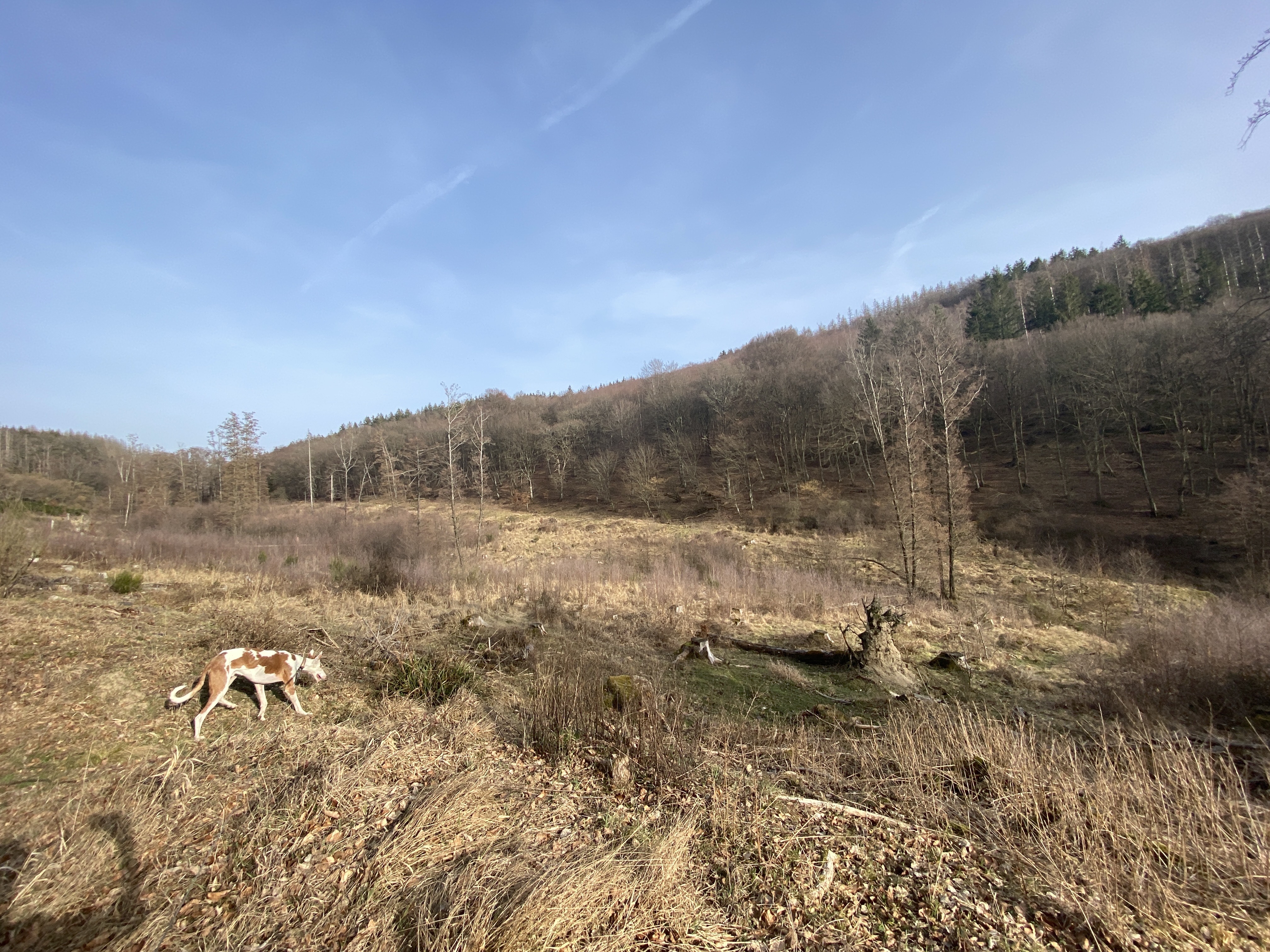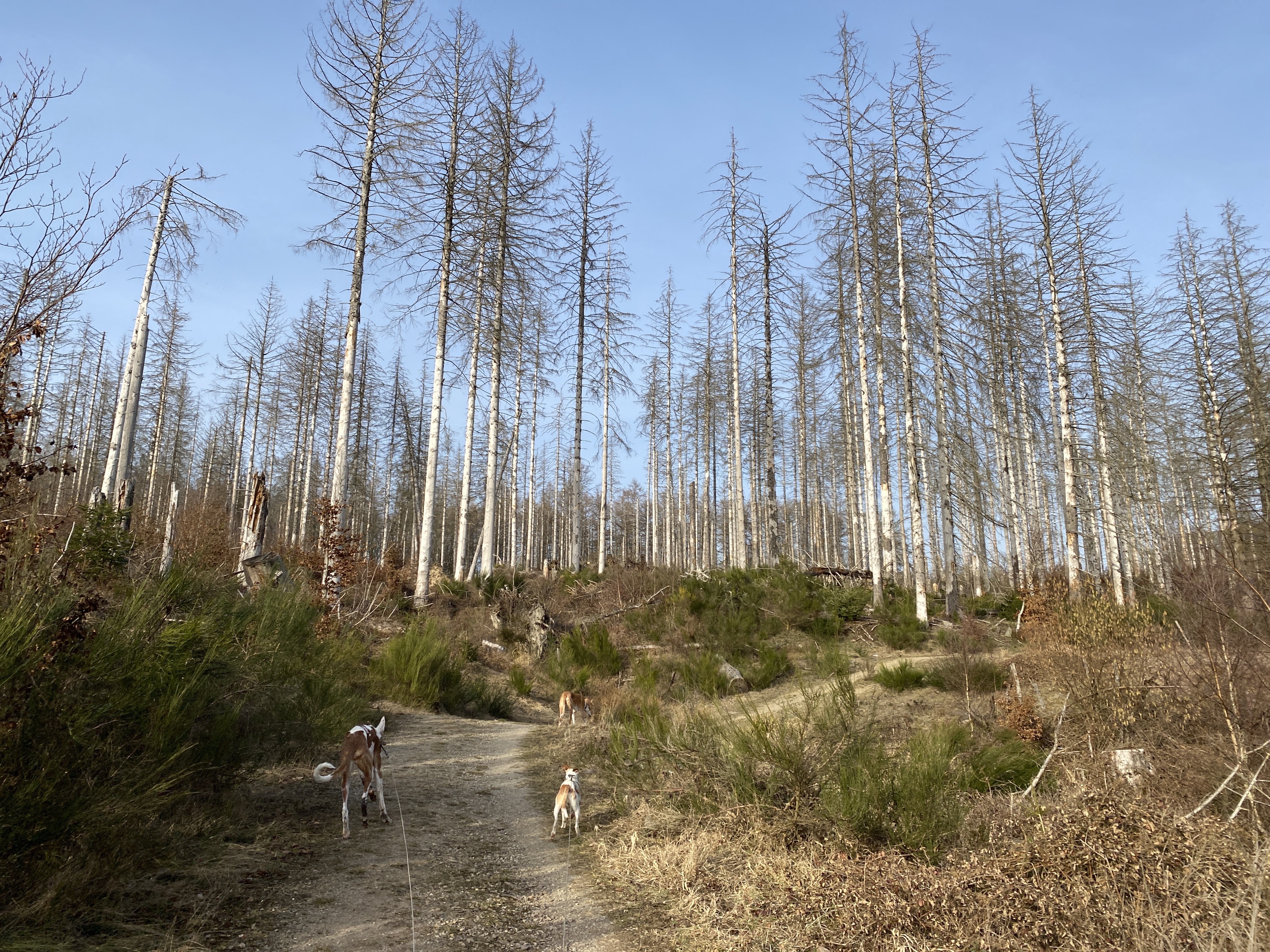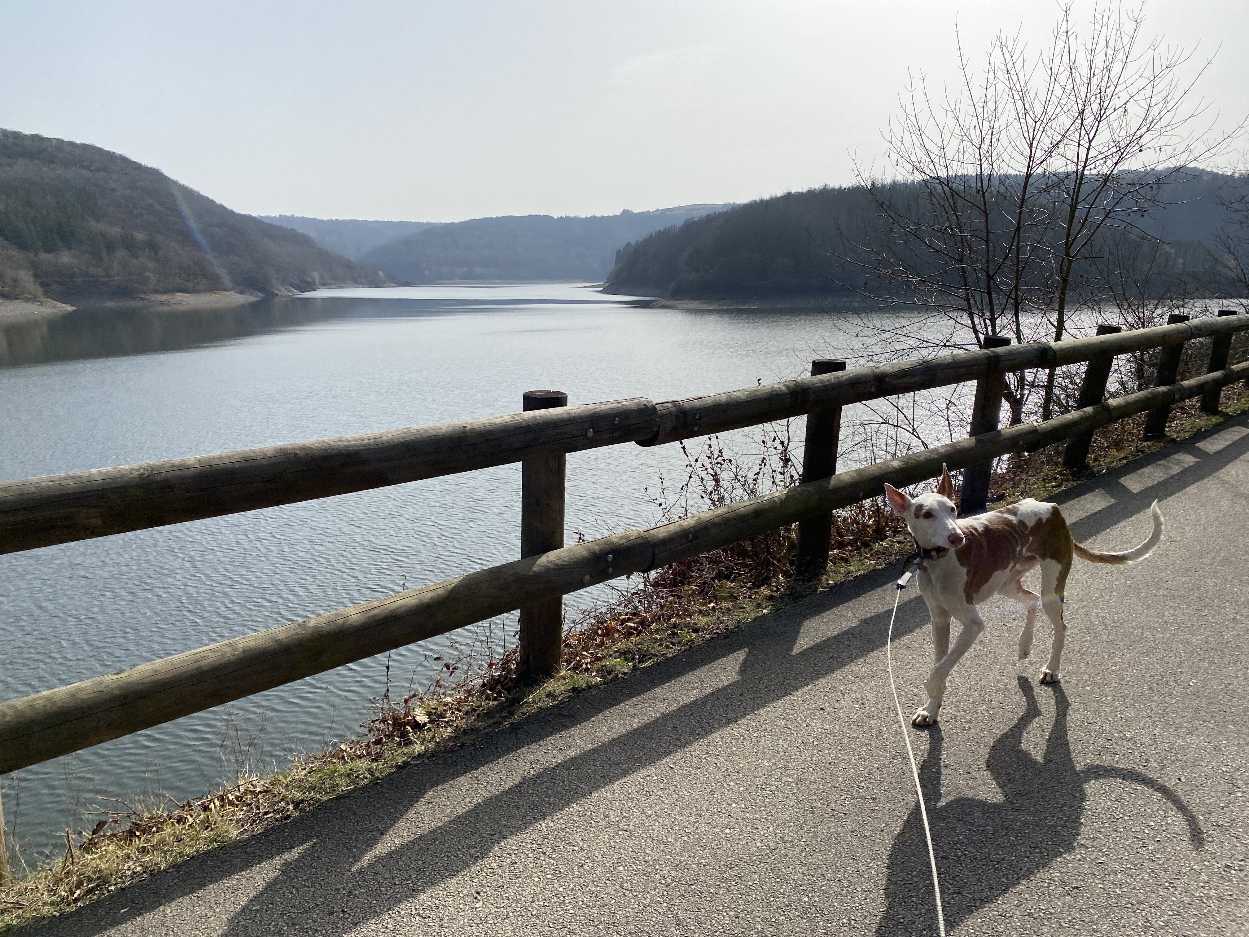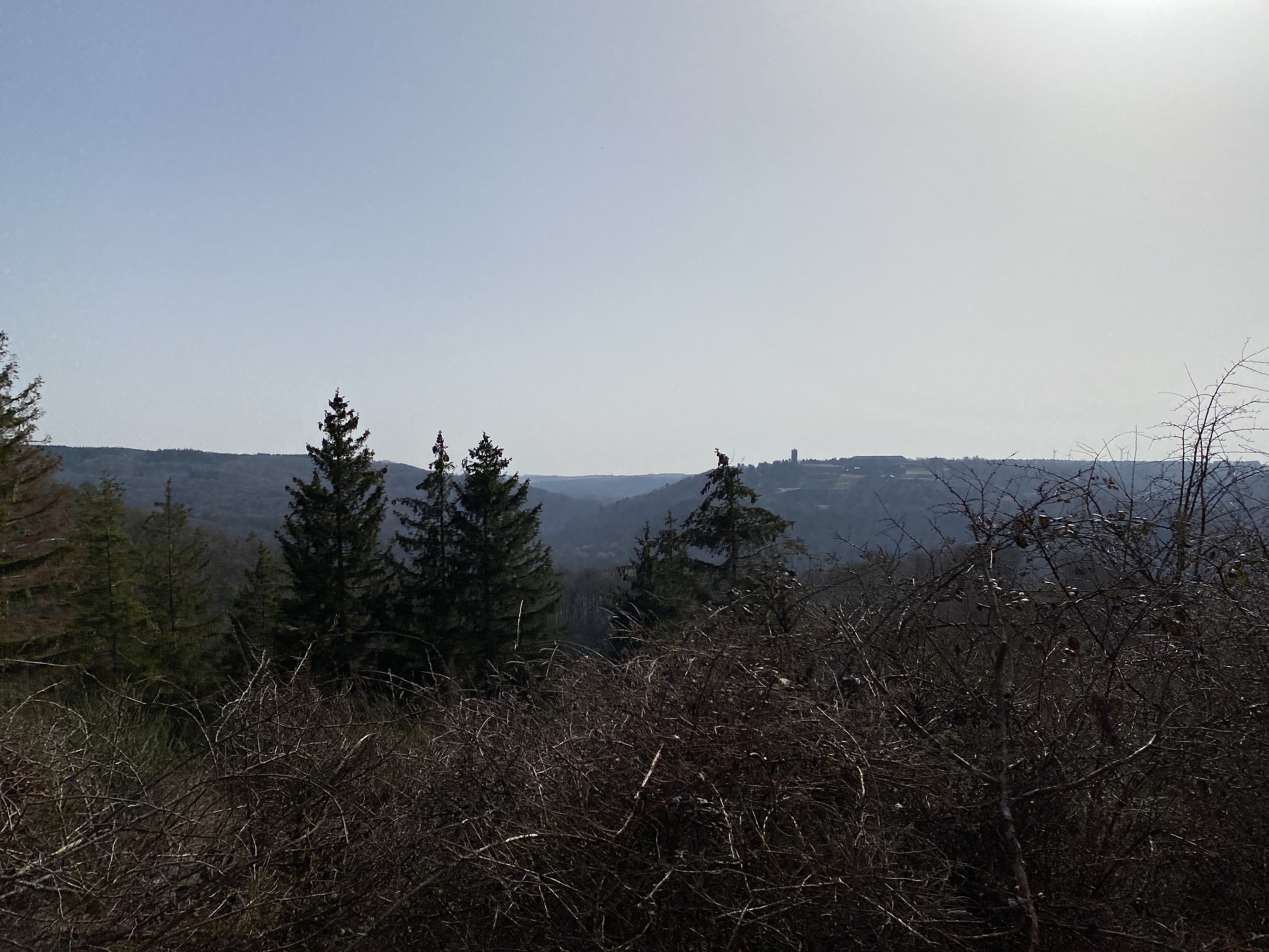- den Abstieg (ca 8,5 km) vom Wanderparkplatz auf dem Kermeter (528m NN) durch den unbewirtschafteten, durch das Fichtensterben stark im Wandel begriffenen Wald des Nationalparks zur Urftstaumauer mit Innen- und Außengastronomie, die aktuell wegen Corona geschlossen sind; man kann aber zumindest dort sein mitgebrachtes Picknick verzehren;