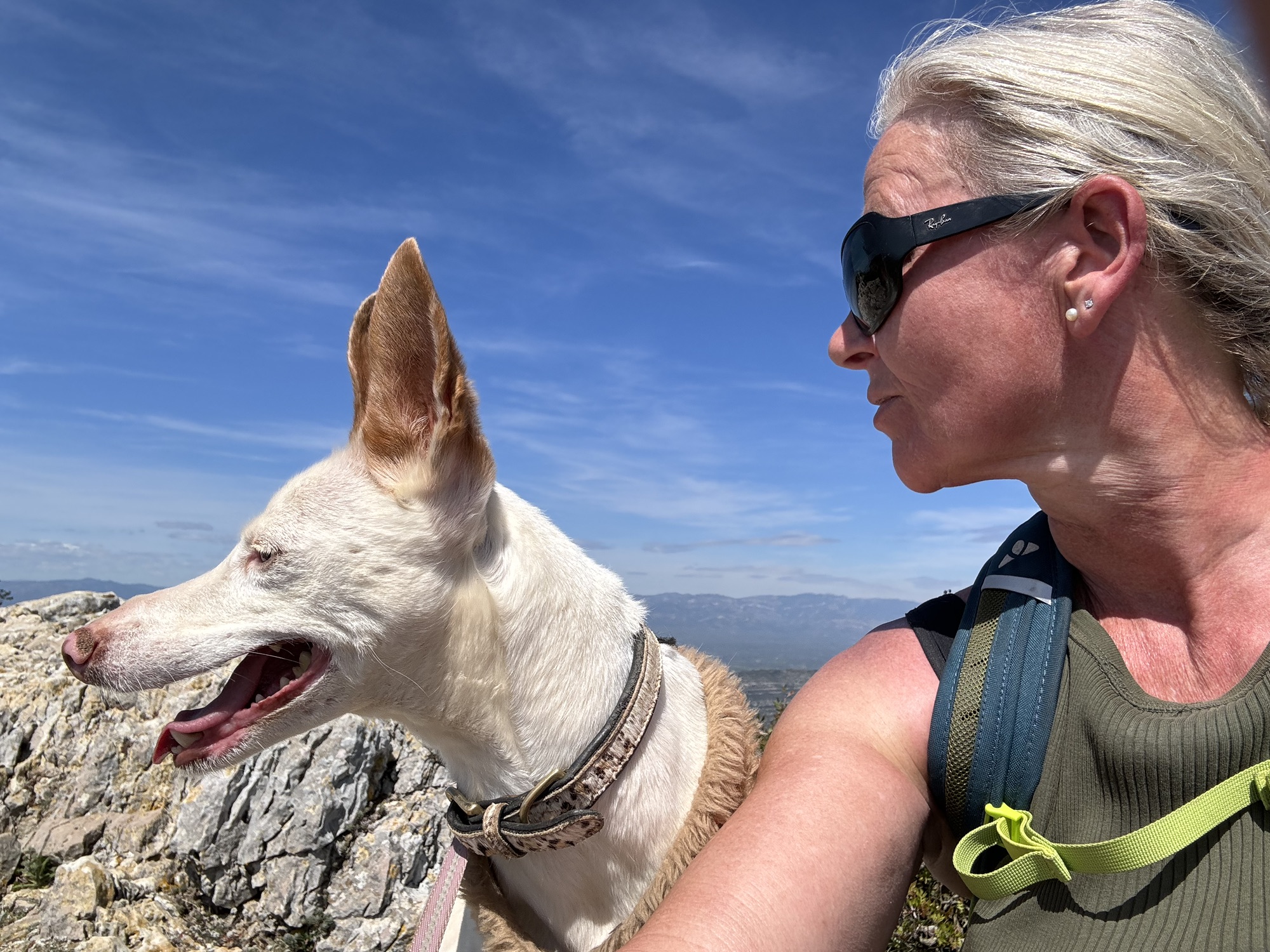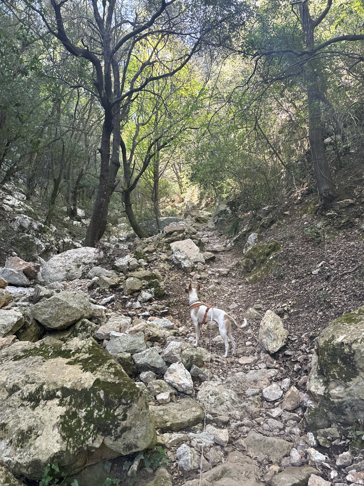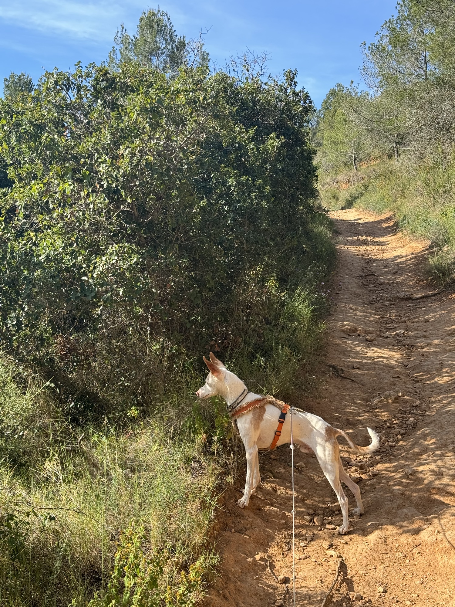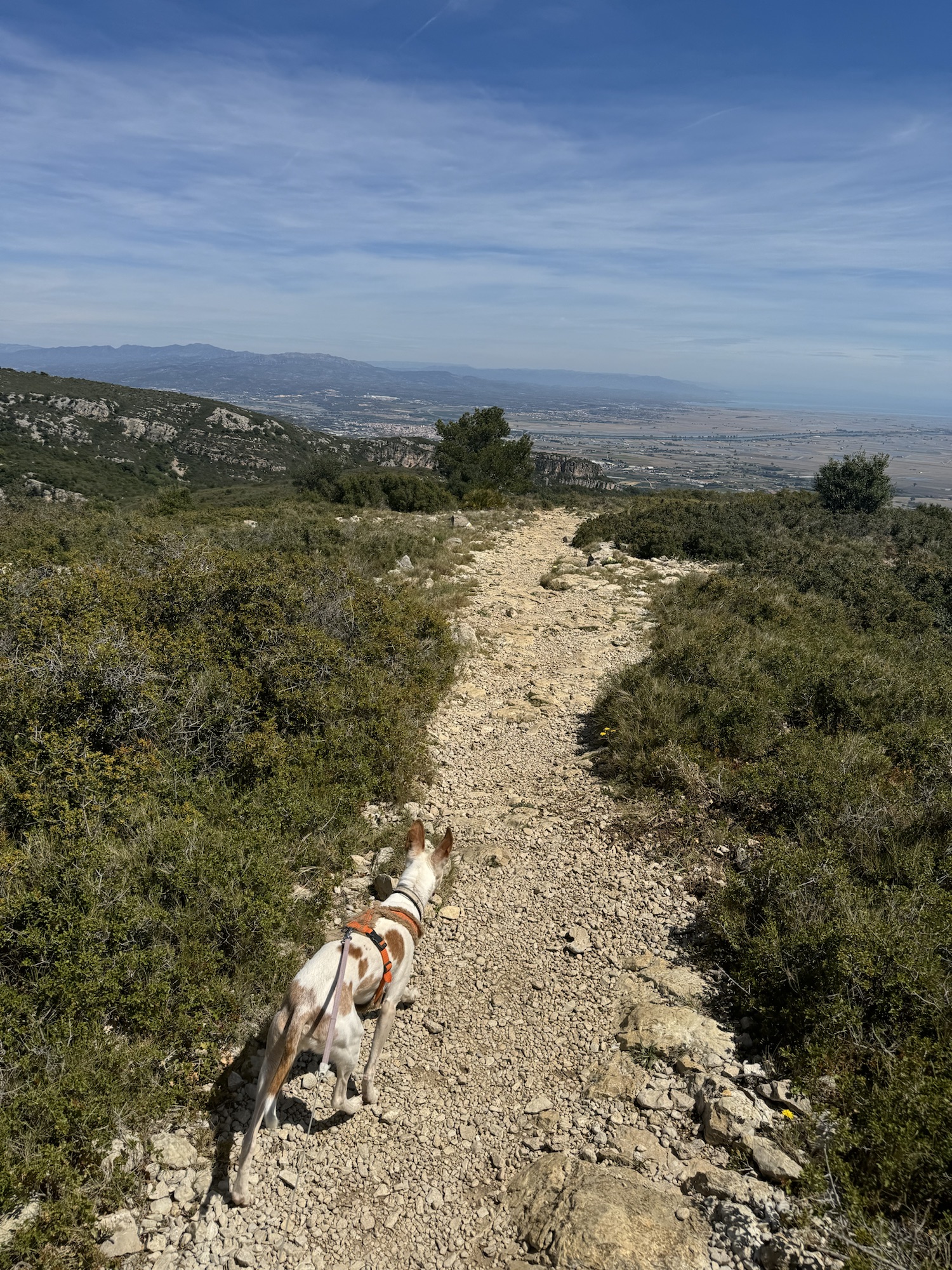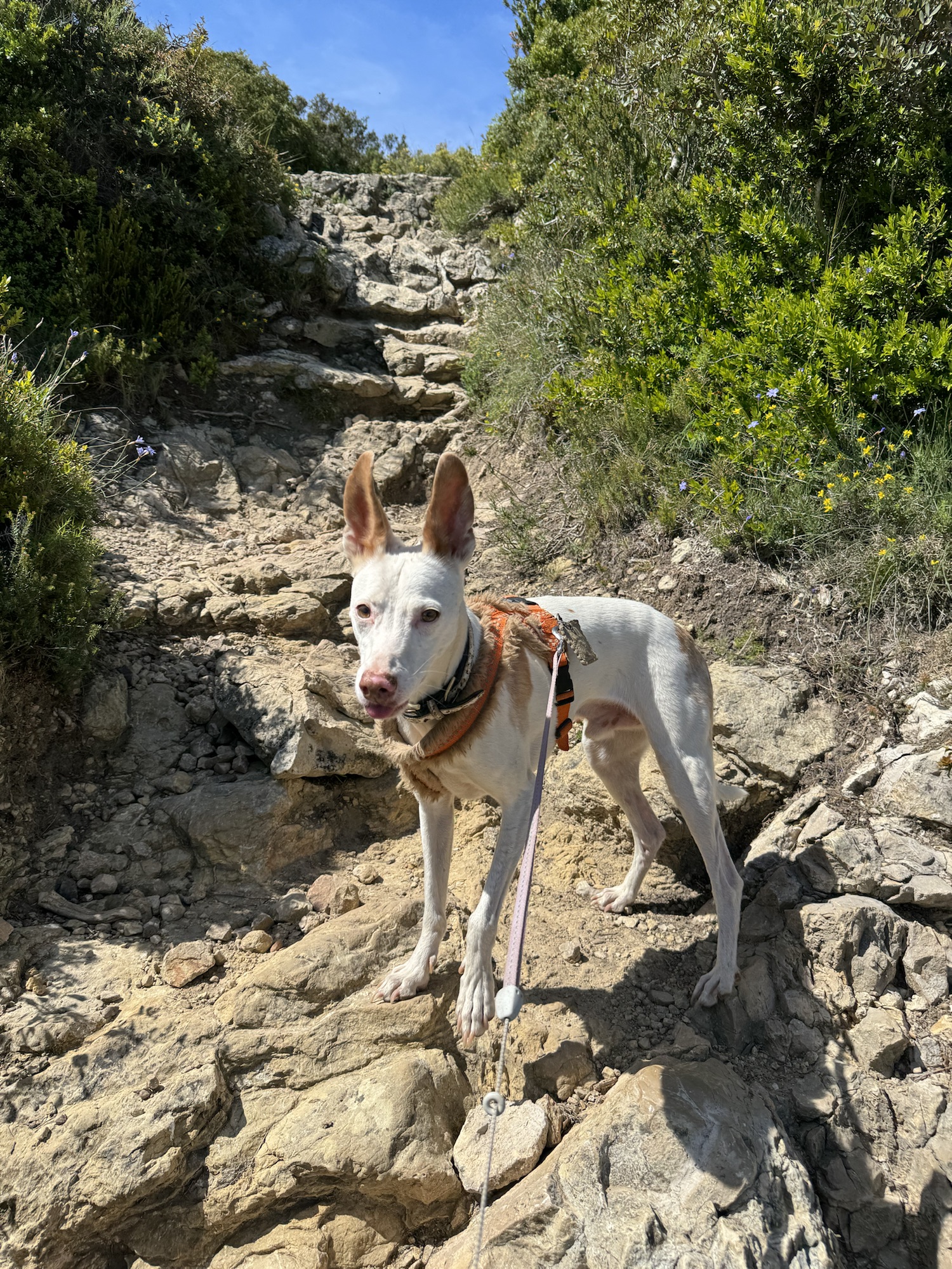 Freunde hatten mich gewarnt, dass der Wanderweg hinauf nicht gerade barrierefrei ist: Stein- und stufenreich nämlich, mit vielen Stolperfallen und Sturzgefahren. Mehrere, womöglich zugkräftige Hunde mitzunehmen, war also keine Option. Deshalb entschied ich mich für TINNITUS, meinen kleinen Podenco Andaluz: Wieselflink, federleicht, topfit, und er klettert wie eine Bergziege. Mit der Flexi am Bauchgurt würde er mich bei Auf- und Abstieg überhaupt nicht belasten.