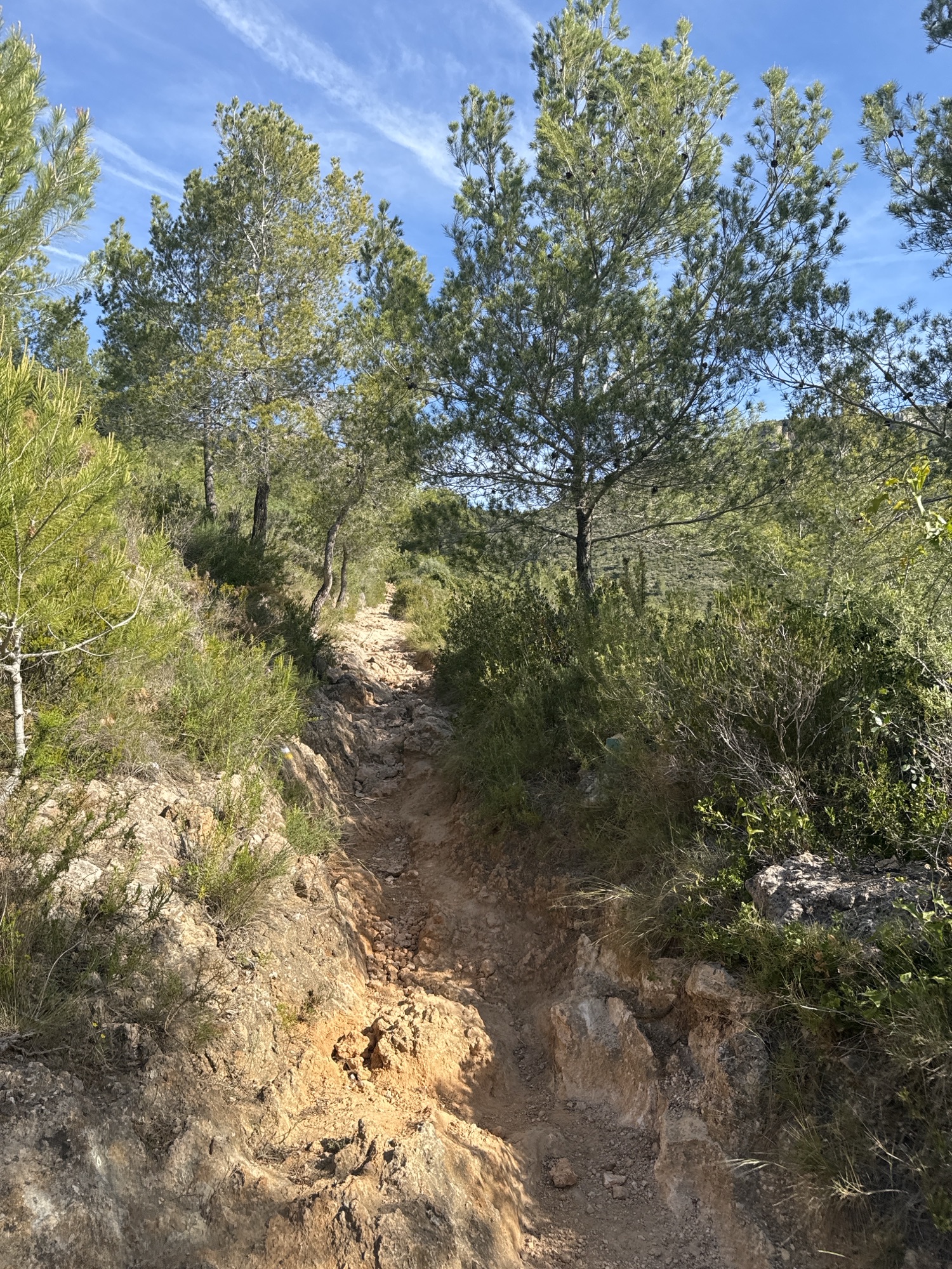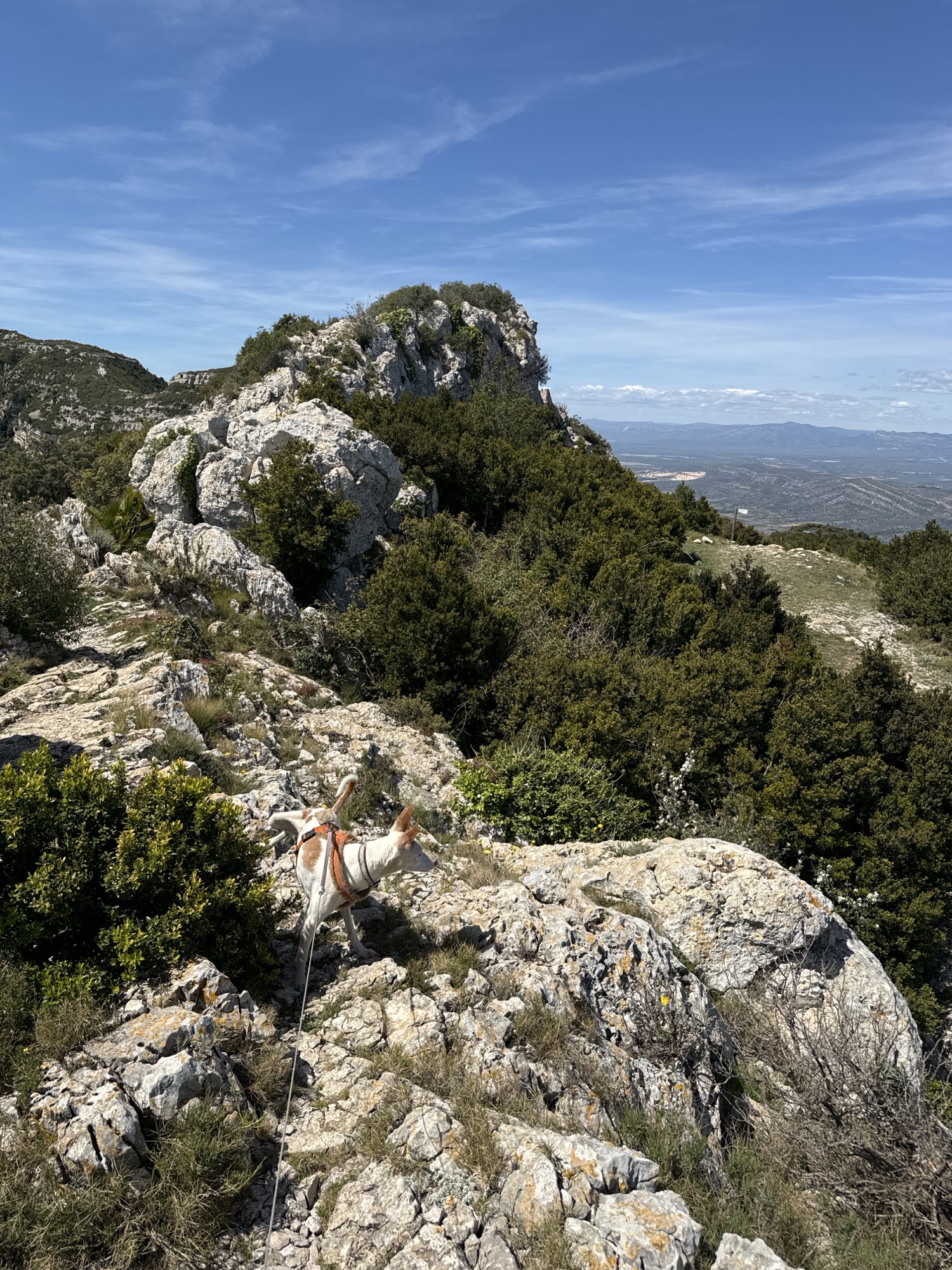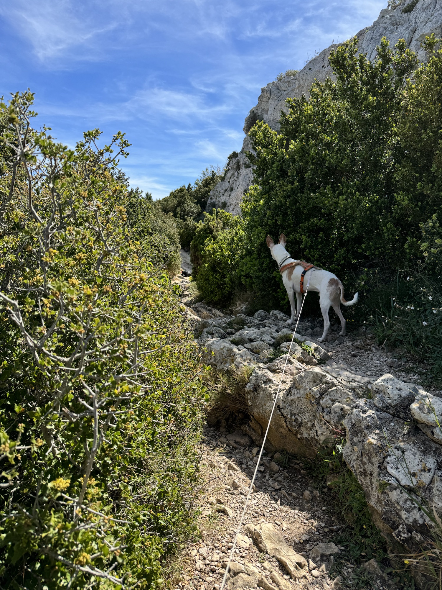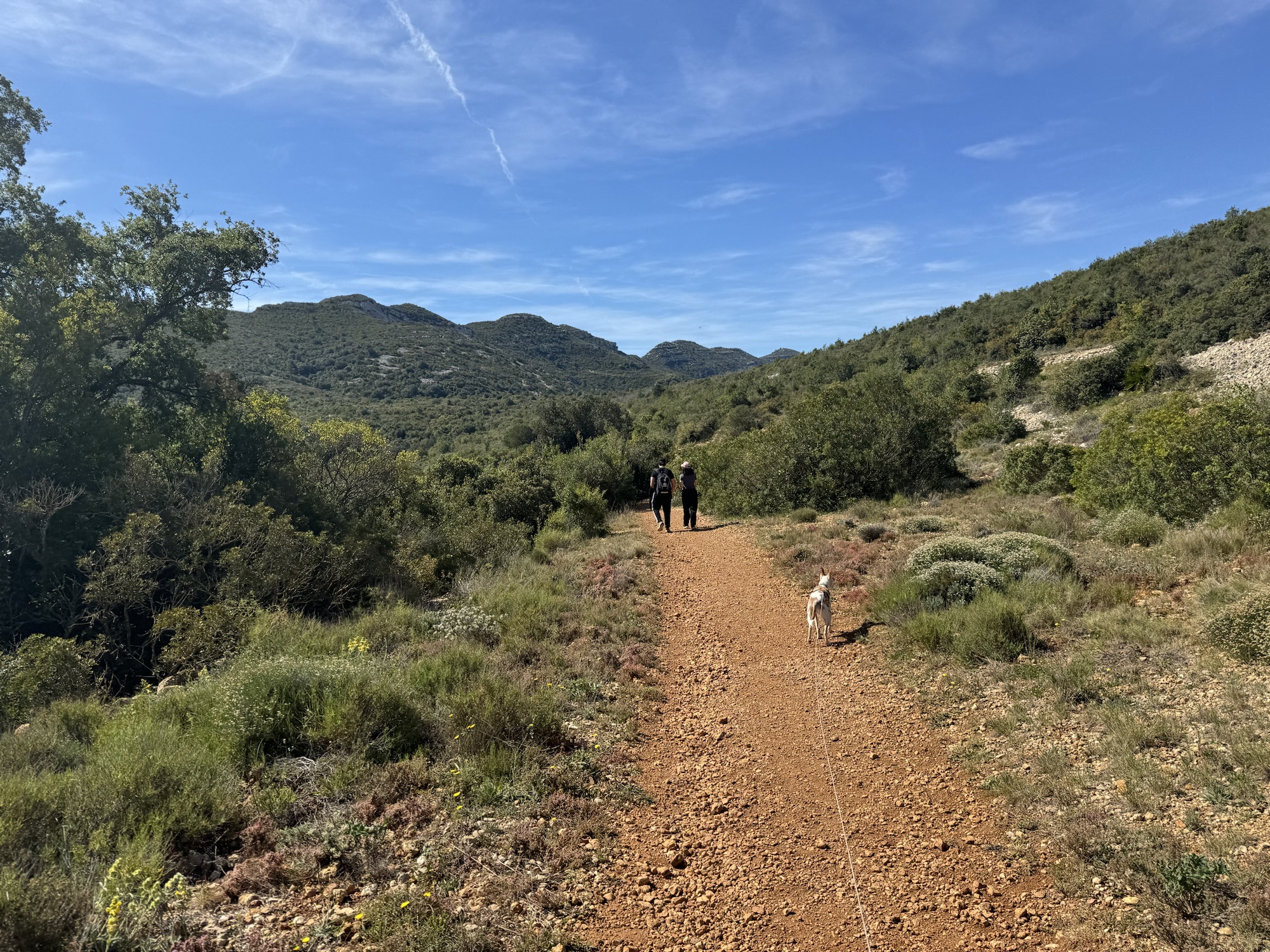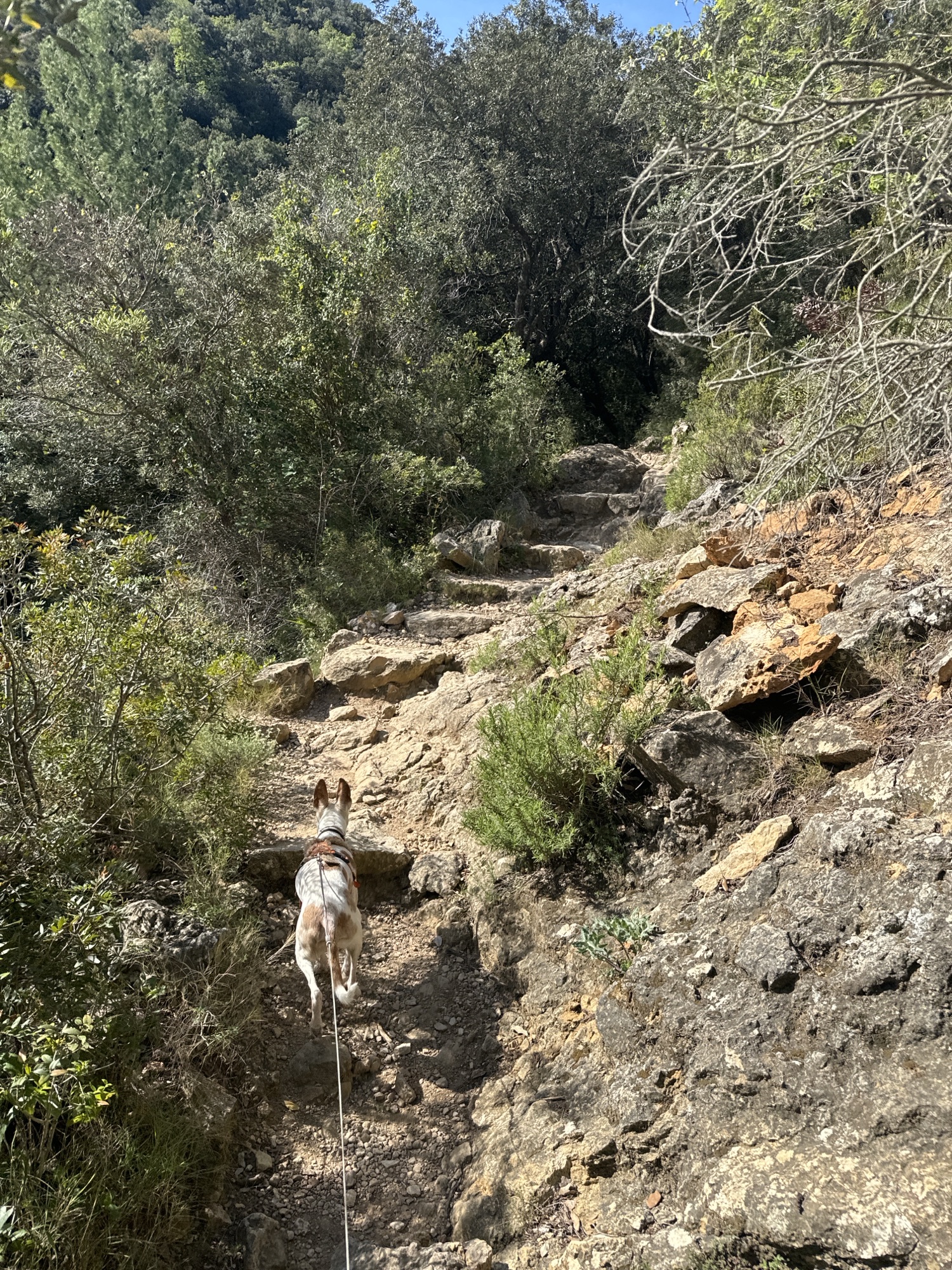 Freunde hatten mich gewarnt, dass der Wanderweg hinauf nicht gerade barrierefrei ist: Stein- und stufenreich nämlich, mit vielen Stolperfallen und Sturzgefahren. Mehrere, womöglich zugkräftige Hunde mitzunehmen, war also keine Option. Deshalb entschied ich mich für TINNITUS, meinen kleinen Podenco Andaluz: Wieselflink, federleicht, topfit, und er klettert wie eine Bergziege. Mit der Flexi am Bauchgurt würde er mich bei Auf- und Abstieg überhaupt nicht belasten.