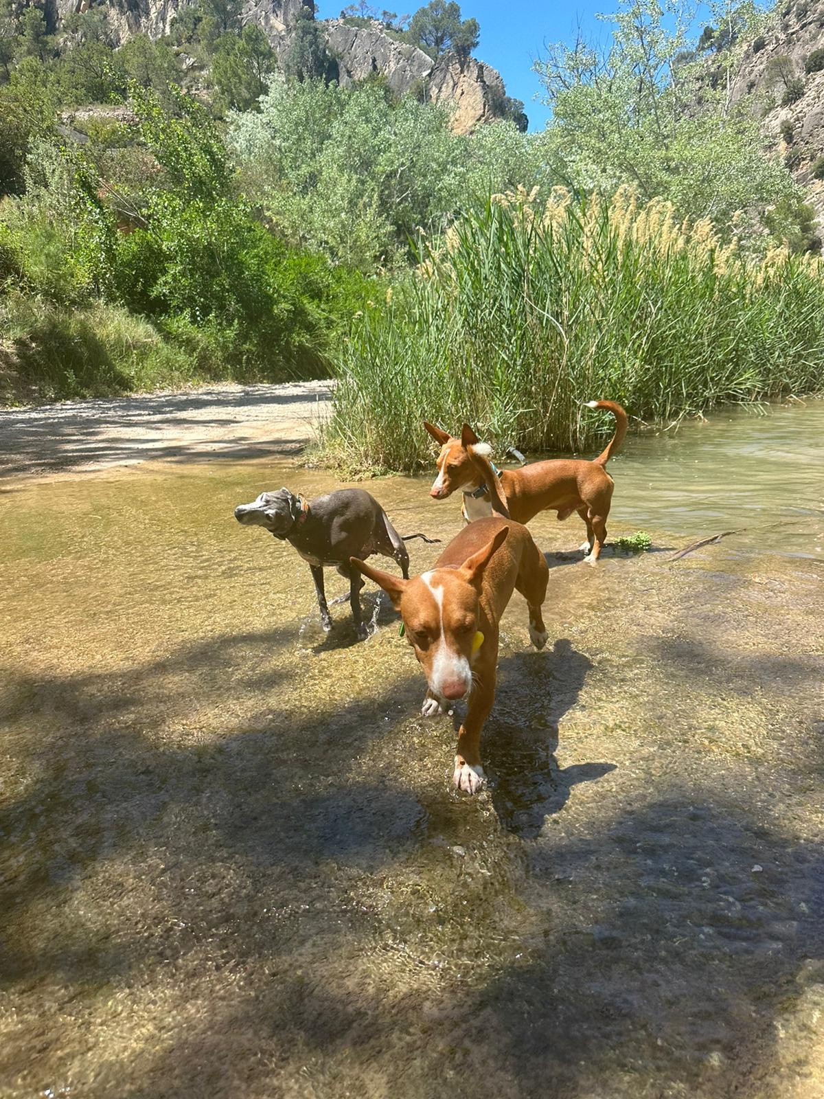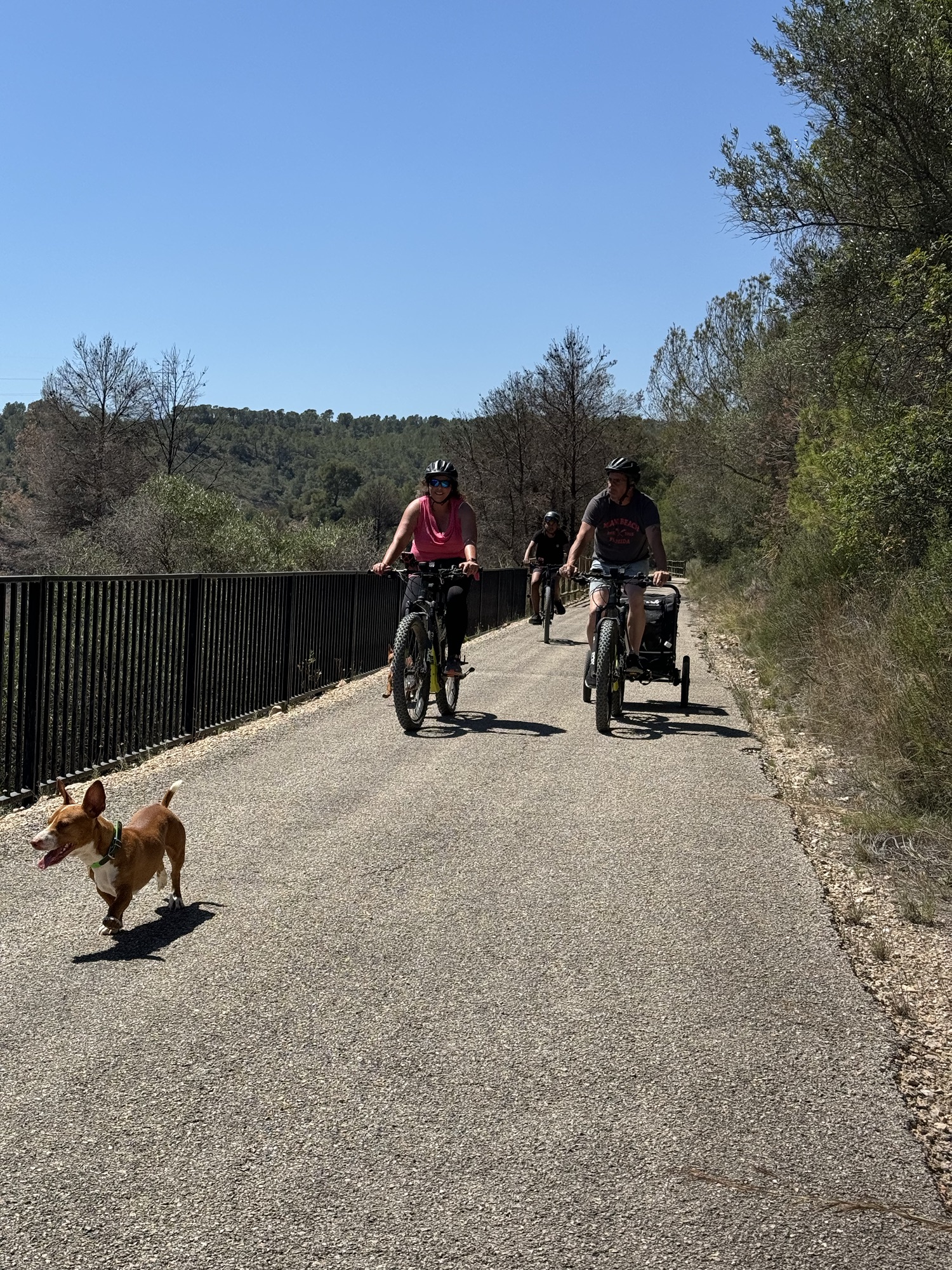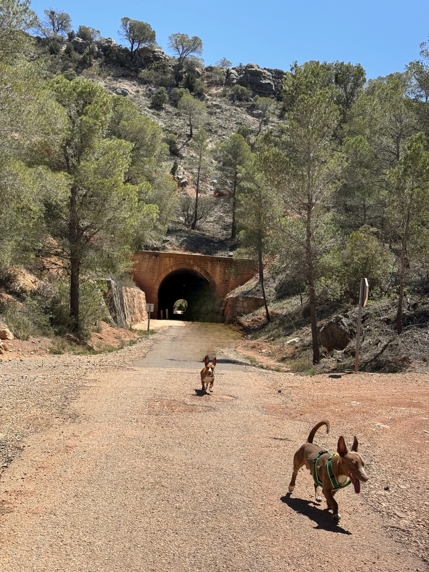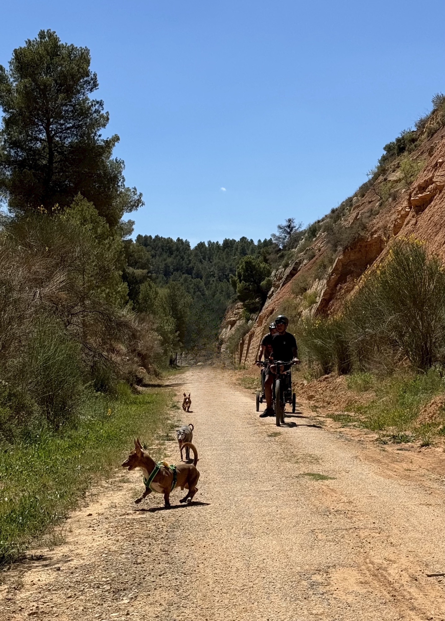 Mit einer Länge von rund 24 km (zwischen El Pinell de Brai und Arnes-Lledó) ist dieser Abschnitt des Weges recht kurz, deshalb bot es sich an, auch ein paar kleine Podencos (Manetos) im Hänger mit auf die Tour zu nehmen. Außerhalb der Saison und an einem Wochentag ist die Strecke so leer, dass man ohne Weiteres Hunde immer mal nebenher laufen lassen kann, ohne irgendjemanden zu belästigen; außerdem ist die Strecke so abgelegen und geschützt, dass die Hunde kaum auf gefährliche Abwege geraten können – zumal sie am Rad eh etwas besser Acht geben als zu Fuß.