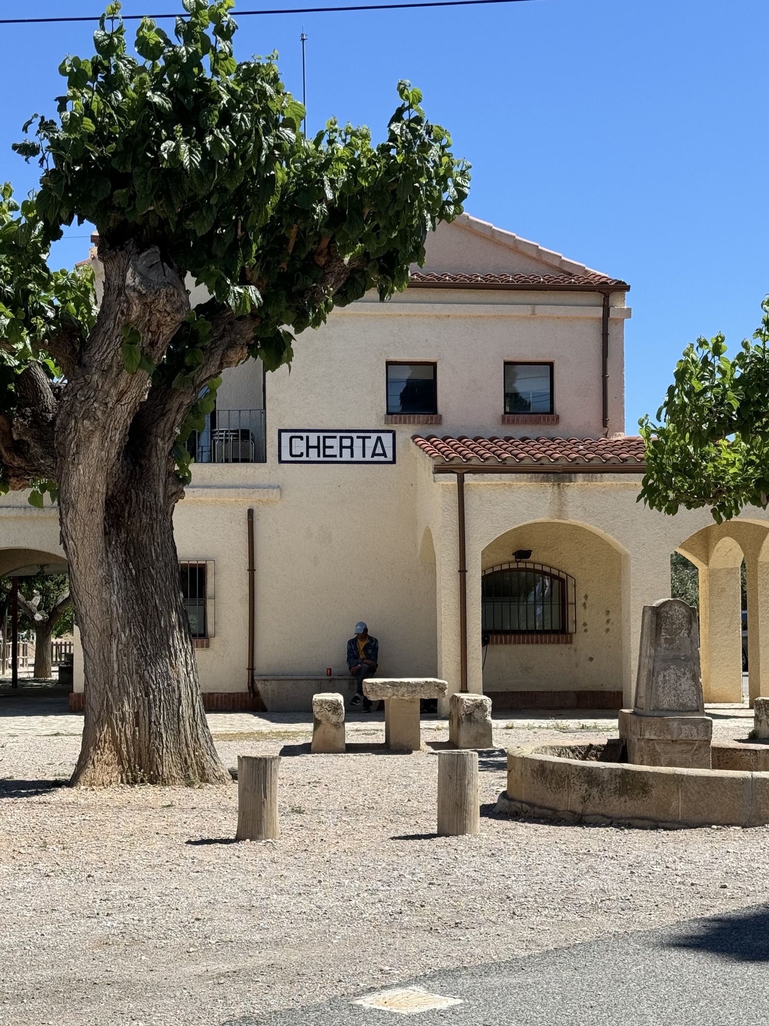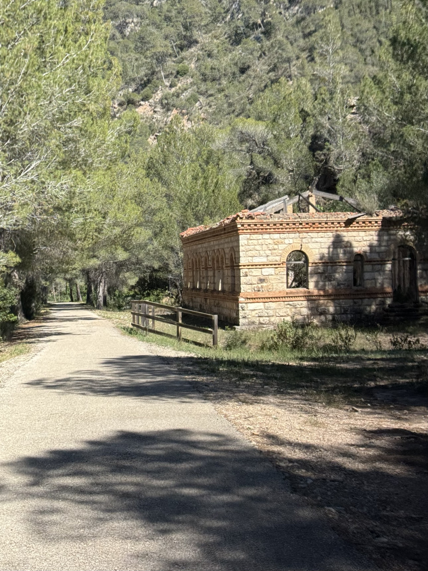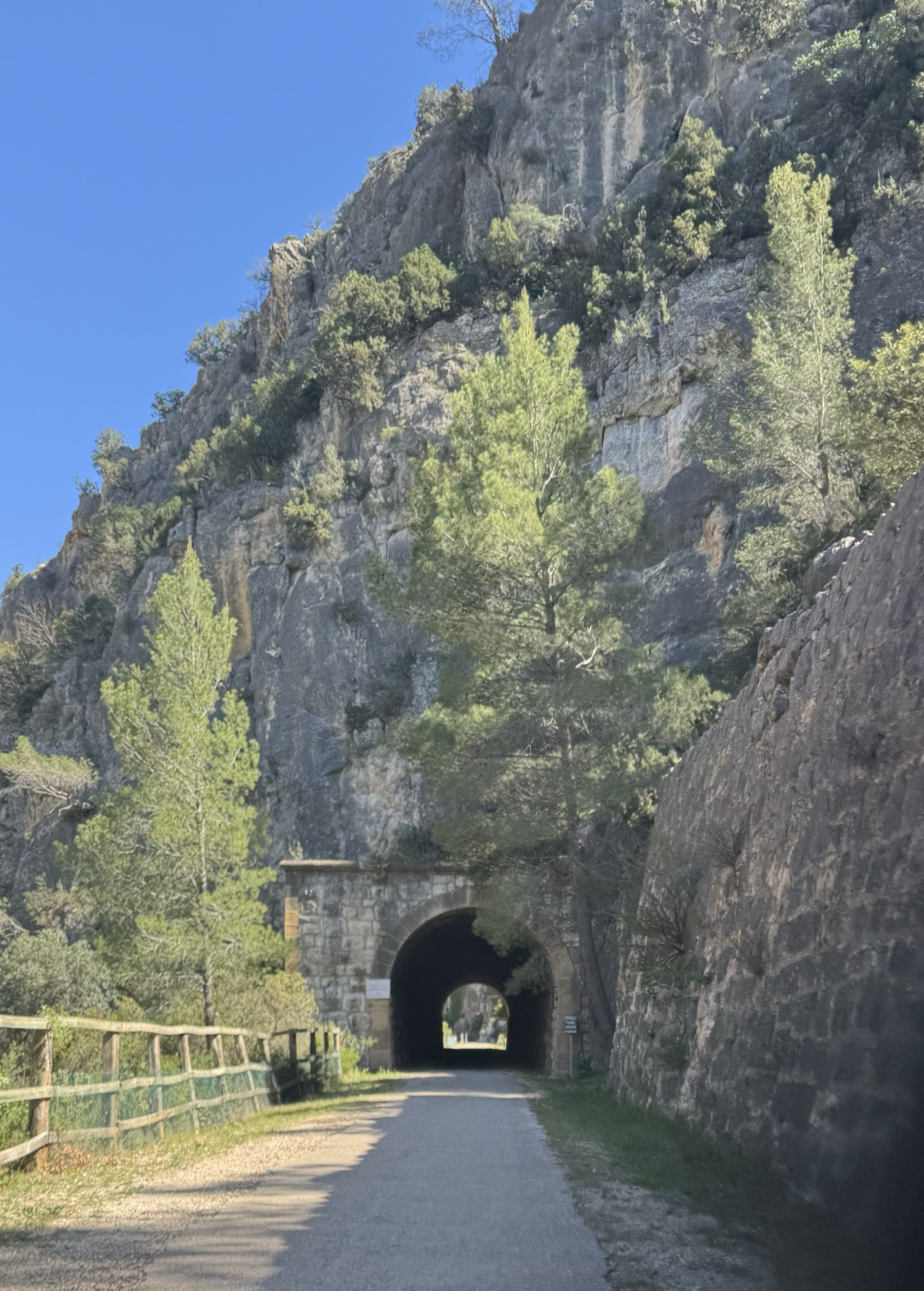 Wir starteten am alten Bahnhof von Xerta, etwas nördlich von Tortosa, und fuhren zunächst ein Stück am schönen Fluss Ebro entlang, bis wir den Bahnhof von Benifallet erreichten. Ab hier wird die pinienbewachsene Felslandschaft (dieser Duft!) immer wieder von meist solarbeleuchteten Tunneln unterbrochen, die willkommene Auszeiten von Sonne und Hitze gewähren. Der längste ist über 700m lang! Man kann sich vorstellen, unter welchen Mühen die Strecke Mitte des 19. Jahrhunderts gebaut wurde. Rund 90 Jahre war sie in Betrieb, bis Anfang der 70er Jahre ein verschütteter Tunnel das Ende des Schienenverkehrs besiegelte.