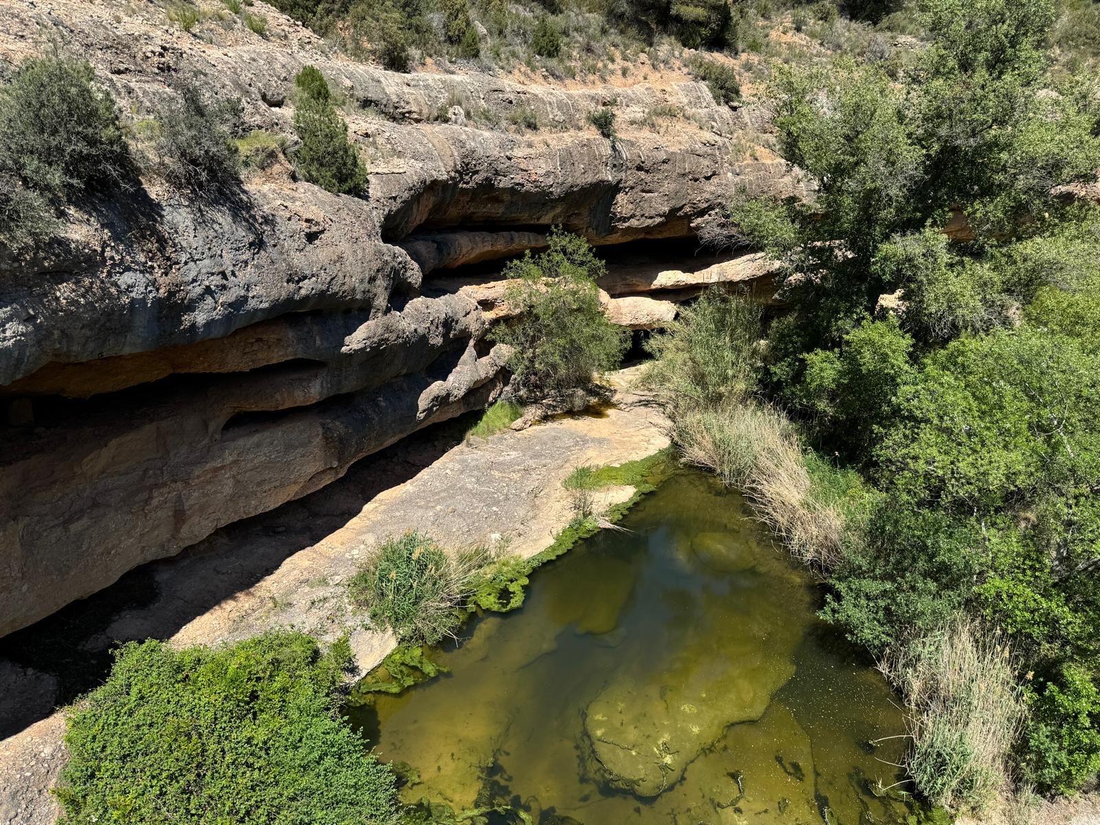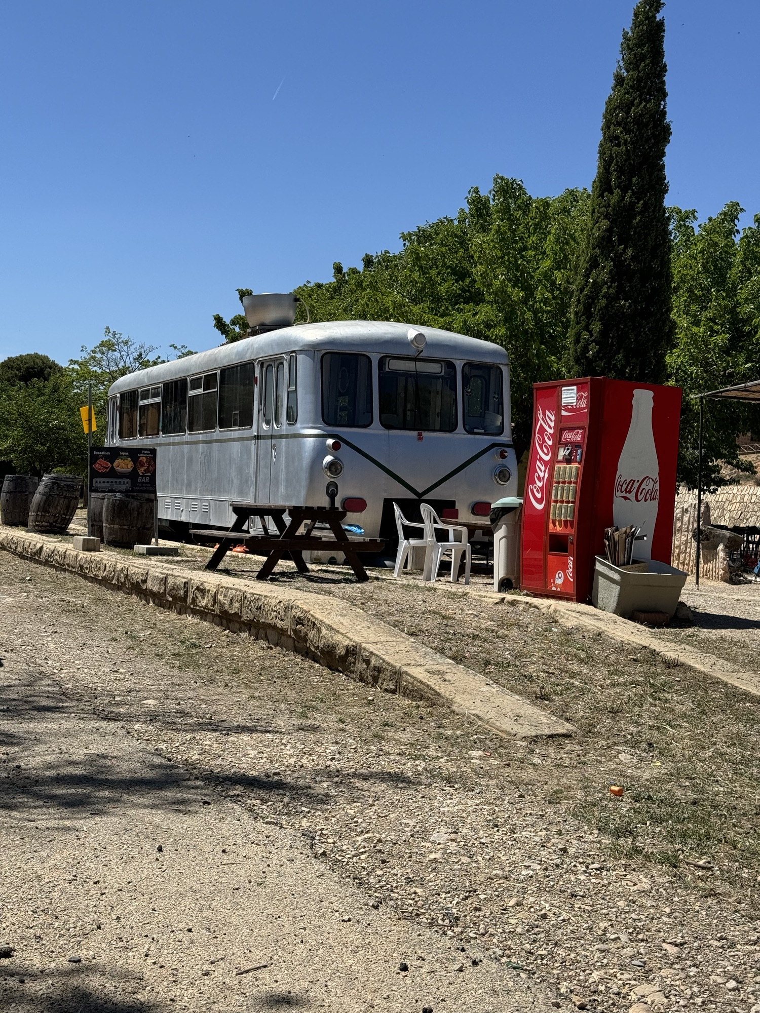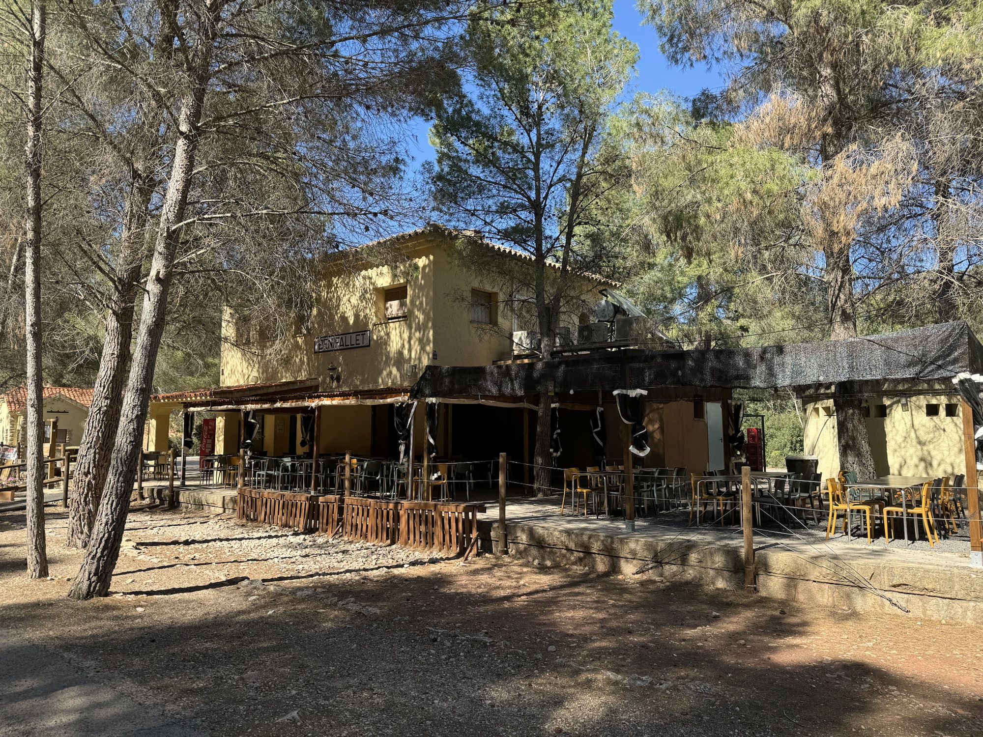 Entlang des Weges liegen etliche verlassene kleine Bahnhöfe, großenteils baufällig; einige sind jedoch zumindest am Wochenende bewirtschaftet oder haben bestückte Cola-Automaten. An unserem Ausflugstag hatte am alten Bahnhof von Bot, auf dem letzten Drittel der Strecke, ein Café in einem alten Triebwagen geöffnet. Die Hunde haben sich am Fluss Canaletes (hier ist auch ein Kloster mit Restaurant, „Santuario de la Fontcalda“) zudem beim Planschen erfrischen können!